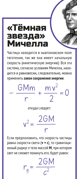 Ответом стал так называемый гравитационный радиус, прямо пропорциональный массе звезды и обратно пропорциональный квадрату скорости объекта-«беглеца», будь то камень, пушечное ядро, спутник или частица света (от его массы всё равно ничего не зависит). В случае со светом мы получаем «тёмную звезду», невероятный объект, наглухо «закупоренный» в своём гравитационном поле. Как позже писал Лаплас, пришедший к такому же выводу, «звезда с плотностью равной плотности Земли и диаметром в 250 раз большим диаметра Солнца, не даёт световому лучу достичь нас благодаря своему тяготению, а потому не исключено, что самые яркие тела во Вселенной по этой причине невидимы».