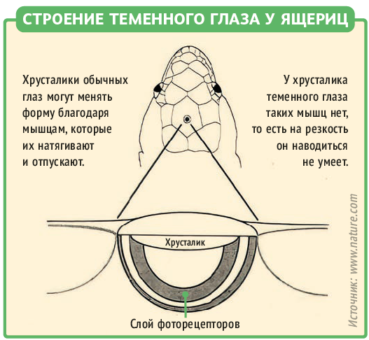 Если весна уже пришла в ваши края, сходите на прогулку и найдите ящерицу. Посмотрите на её голову сверху. На макушке между глаз вы заметите маленькую выпуклую точку, которая по цвету отличается от остальной кожи. Это — третий глаз.