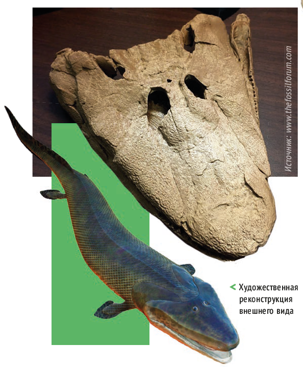 Древняя рыба тиктаалик возрастом 375 млн лет и её череп. Два углубления спереди — глазницы, и большая точка посередине чуть выше них — отверстие для третьего глаза.