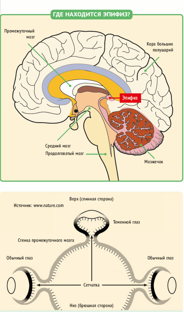 Свет подавляет работу фоточувствительных клеток третьего глаза, а в темноте они активизируются и подают сигналы различным областям мозга. Мелатонин тоже образуется ночью, а днём его производство почти не идёт.