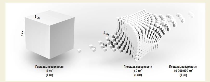 Нанотехнология – это область науки, которая занимается созданием, изучением и использованием объектов, размеры которых составляют от 1 до 100 нанометров. Эти объекты из наномира обладают рядом особенностей и преимуществ по сравнению с объектами из макромира. Во-первых, в масштабах наномира действуют силы, характерные и для больших тел, и для атомов и молекул, благодаря чему, например, у наночастиц металлов могут проявляться полупроводниковые свойства. Во-вторых, объекты из наномира настолько малы, что вовсе не имеют дефектов. В-третьих, несмотря на свои мини-размеры, они имеют огромную площадь поверхности на единицу массы. К примеру, металлический куб с ребром 1 см имеет площадь поверхности равной 6 см2 . Тогда как этот же куб, разделённый на множество меньших кубиков с ребром 1 нм, будет иметь площадь поверхности в 60 000 000 см2 . В случаях каталитически активных материалов, данное явление позволяет ускорить химические реакции в сотни, тысячи и миллионы раз при использовании наночастиц.