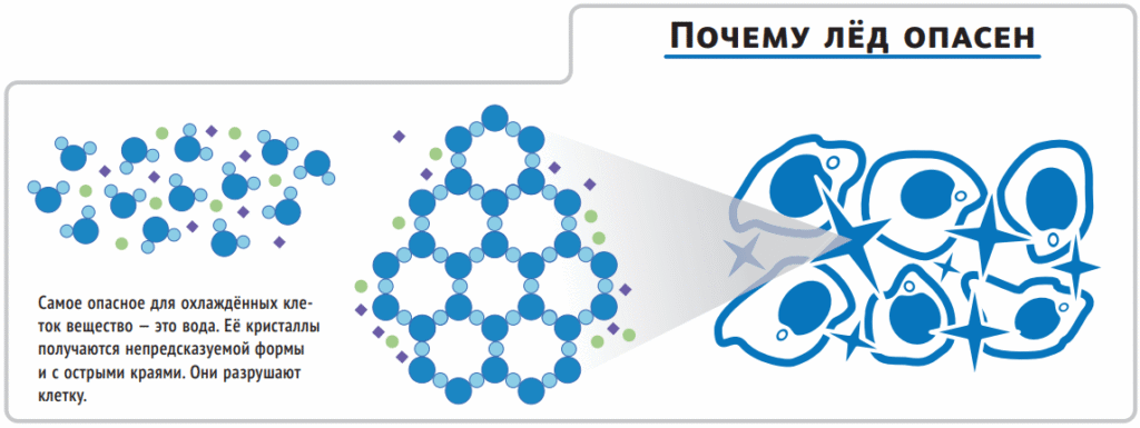Самое опасное для охлаждённых клеток вещество — это вода. Её кристаллы получаются непредсказуемой формы и с острыми краями. Они разрушают клетку.