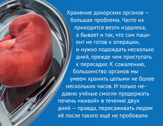Хранение донорских органов — большая проблема. Часто их приходится везти издалека, а бывает и так, что сам пациент не готов к операции, и нужно подождать несколько дней, прежде чем приступать к пересадке. К сожалению, большинство органов мы умеем хранить целыми не более нескольких часов. И только недавно учёные смогли продержать печень «живой» в течение двух дней — правда, пересаживать людям её после такого ещё не пробовали