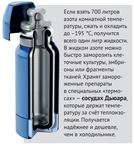 Если взять 700 литров азота комнатной температуры, сжать и охладить до –195 °C, получится всего один литр жидкости. В жидком азоте можно быстро заморозить клеточные культуры, эмбрионы или фрагменты тканей. Хранят замороженные препараты в специальных «термосах» — сосудах Дьюара, которые держат температуру за счёт теплоизоляции. Получается надёжнее и дешевле, чем в холодильнике.