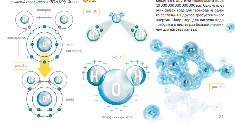 Вам уже известно, что молекула воды состоит из атомов водорода и кислорода. Единственный электрон на внешнем энергетическом уровне атома водорода образует с одним электроном кислорода ковалентную связь (см. статью «Удивительный мир химии» в OYLA №4). Оставшийся электрон кислорода образует ещё одну ковалентную связь с ещё одним атомом водорода. Так получается молекула H2 O (рис. 1а).