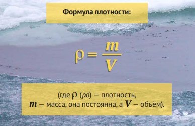 Важным физическим параметром воды является её теплоёмкость. Она аномально большая по сравнению с другими жидкостями. Эта характеристика показывает количество теплоты, которое вода способна поглотить, она помогает поддерживать устойчивый климат на нашей планете. Эта особенность воды защищает поверхность Земли от перегрева под воздействием солнечных лучей днём и от переохлаждения ночью, так как накопленную днём теплоту вода ночью обратно сообщает воздуху. По этой причине лёд плавает на поверхности воды, защищая её от полного замерзания. Ледники в океанах выступают в роли ледяной «шубы», которая защищает морских обитателей от замерзания и гибели. Формула плотности: (где ρ (ро) — плотность, m — масса, она постоянна, а V — объём). ρ = m V