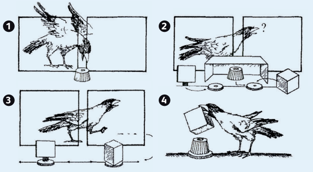 Вороне показали объёмную приманку, а затем приманка скрылась за одной из фигур. Грани этих фигур были одинакового размера и формы, но одна плоская (квадрат), а другая объёмная (куб). Получив доступ к ним, ворона не увидела приманки, но поняла, что искать следует внутри. Она не стала тратить время на проверку плоской фигуры, а сразу перевернула объёмную, так как знала, что объёмная приманка может поместиться только туда.
