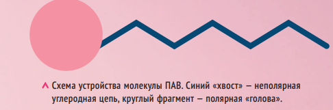 Поверхностно-активное вещество — именно так расшифровывается аббревиатура ПАВ — это главный компонент моющих средств: собственно, он обеспечивает очищающую функцию. Молекула ПАВ состоит из двух частей — длинной углеродной цепочки, которая вступает в контакт с жиром, и фрагмента, который притягивает молекулы воды. Именно благодаря этому свойству поверхностно-активные вещества позволяют смывать жирный налёт и загрязнения.