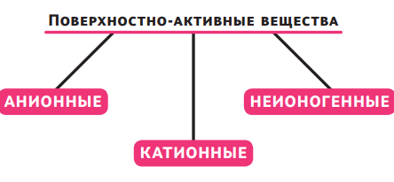 Поверхностно-активные вещества бывают анионными, катионными, неионогенными. Стеарат натрия, один из основных компонентов мыла, содержит ПАВ-компонент, полярная «голова» которого заряжена отрицательно. Такой фрагмент называется анионом, а ПАВ, устроенные похожим образом, называют анионными. Исторически это первые ПАВ, но у них есть свой недостаток: они активно взаимодействуют с катионами кальция и магния, которые содержатся в жёсткой воде. В результате моющее действие вещества пропадает.