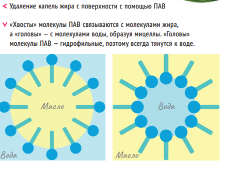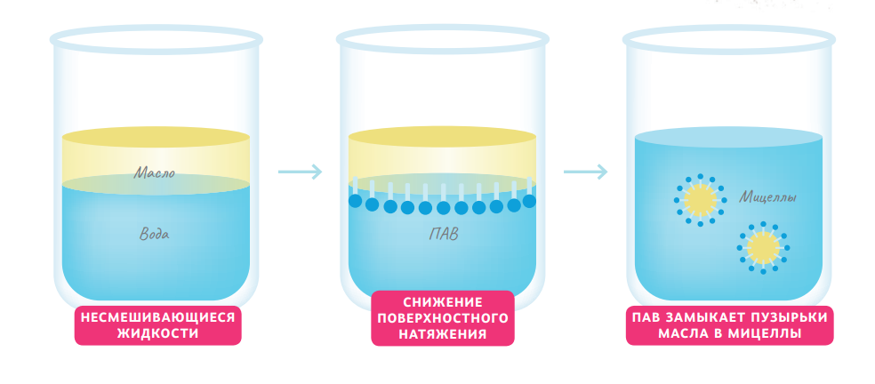 В результате на границе «вода— масло» оказывается слой молекул, силы притяжения которых не скомпенсированы. А ПАВ, добавленное в смесь масла и воды, снижает такое поверхностное натяжение.