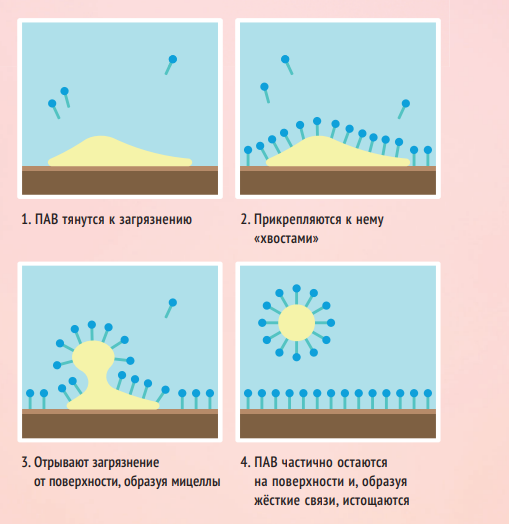 При контакте ПАВ с поверхностью жидкости или твёрдого тела происходит процесс адсорбции — молекулы поверхностно-активного вещества накап ливаются на так называемой границе. В результате свойства загрязнений, покрытых адсорбционными слоями, резко изменяются: гидрофобные поверхности становятся более гидрофильными и начинаются лучше смачиваться водой.
