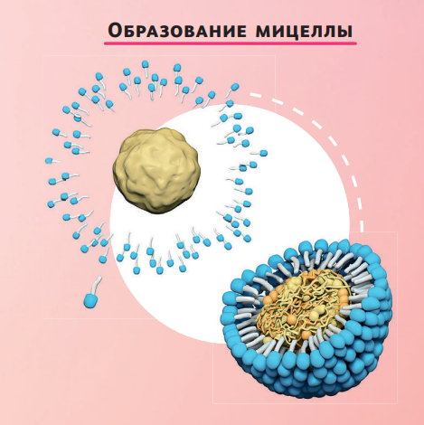 Эта молекула — хороший пример ПАВ. У неё есть длинный неполярный «хвост» и полярная гидрофильная «голова». Слово «гидрофильный» означает, что молекула или её часть хорошо связываются с водой. ПАВ погружаются «хвостами» в капли жира, а торчащие наружу гидрофильные «головы» связываются с молекулами воды. Образуются микроскопические частицы, называющиеся мицеллы, а уж они, в свою очередь, легко смываются водой. Помните, что в косметической индустрии для снятия макияжа часто используют мицеллярный раствор, который советуют обильно смывать водой после использования? Основу такого средства составляют мицеллы жирных кислот, окружённые жидкой средой, — раствор, попадая на кожу, «притягивает» грязь и жир.