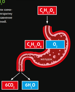Рассмотрим другой пример химической реакции. Например, усваивание углеводов, происходящее в нашем организме. Известно, что организм берет энергию из углеводов, точнее получает ее в результате их химической переработки. Обозначим все углеводы условно формулой глюкозы (С6Н12О6 ). Под воздействием ферментов в организме происходит разрушение глюкозы, и как результат выделяется энергия, необходимая для работы организма. Один из видов разрушения углеводов происходит при участии кислорода. Опишем процесс химическими формулами: