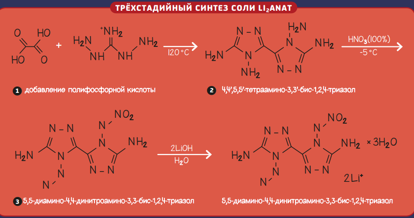 Основа нового состава — тригидрат дилитиевой соли 3,3’-диамино-4,4’-динитроамино-5,5’-бис-1,2,4-триазолят (Li2ANAT). Соль Li2ANAT синтезируется в три стадии. Она отличается высокой температурой разложения (240 °С), а значит, её применение безопасно. Кроме того, соль не поглощает пары воды из окружающей среды (поглощение воды ухудшает горючие свойства). Соединение Li2ANAT одновременно является окислителем и компонентом, придающим пламени окраску. Такое сочетание свойств в одном веществе позволяет уменьшить число компонентов в пиротехнических составах.