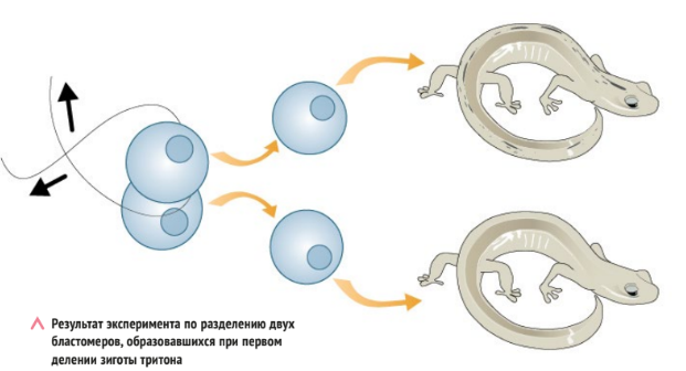 Звучит неплохо, по крайней мере разумнее, чем история с гомункулами. Но есть как минимум одна загвоздка. Эксперименты с зародышами амфибий показали, что, если специальной ниткой аккуратно отделить один бластомер от другого на той стадии развития, когда их всего два (то есть после первого деления зиготы), из каждого вырастают вполне себе нормальные животные. Это верно и для людей, только в нашем случае никто специально клетки не разделял. Иногда они расцепляются сами, и получаются идентичные близнецы. Их ещё называют однояйцевыми — именно потому, что они появились из одной и той же яйцеклетки. Если бы первые два бластомера уже отличались друг от друга по свойствам, ни нормальных амфибий в упомянутых опытах, ни однояйцевых близнецов у человека быть бы не могло.
