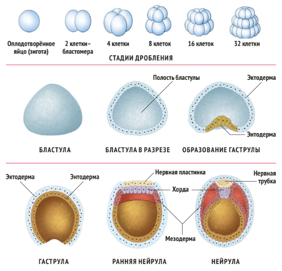 Дробление зиготы и образование зародышевых листков — эктодермы, энтодермы и мезодермы, — которые дадут начало всем тканям будущего организма