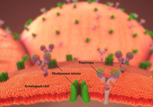 Благодаря особым белковым молекулам на мембране, рецепторам, клетки воспринимают сигналы из окружающей среды. Разные клетки, в зависимости от выполняемых функций, имеют характерный набор рецептов. Внешние химические посредники-молекулы, связываясь с ними, влияют на протекание химических реакций внутри клетки.