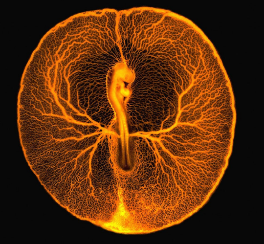 Зародыш курицы в конце четвёртого дня развития. В центре виден сам эмбрион. Во все стороны от него отходят кровеносные сосуды, получающие питание из остатков желтка. Возникновение этих структур из однородной бесклеточной массы и наблюдал Каспар Фридрих Вольф.