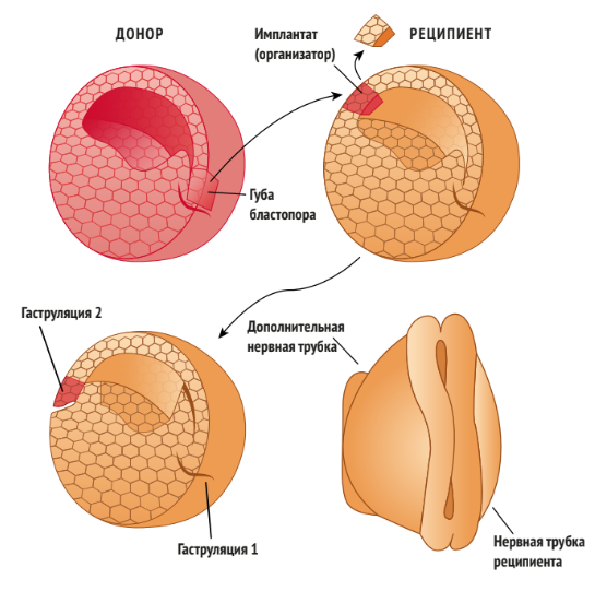 Фрагмент дорсальной губы бластопора одного зародыша тритона подсадили в гаструлу другого «напротив» его собственной дорсальной губы. Сформировался эмбрион с двумя спинами, головами и нервными трубками. Так выяснилось, что одни ткани эмбриона могут влиять на другие, меняя их судьбу. Фрагменты таких тканей называют организаторами.