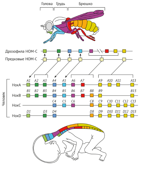 СХЕМАТИЧЕСКОЕ ПРЕДСТАВЛЕНИЕ ГОМЕОЗИСНЫХ ГЕНОВ У ДРОЗОФИЛЫ И ЧЕЛОВЕКА
