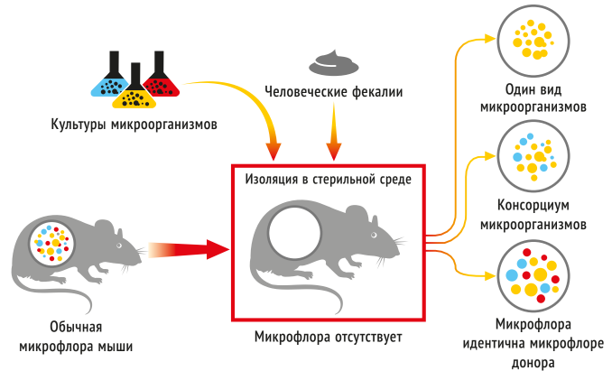 Чтобы изучать влияние отдельных микробов на физиологию, учёные создают безмикробных животных. Им вводят через рот растворы антибиотиков, дают стерильные корм и воду, обрабатывают поверхность тела — словом, добиваются того, чтобы микрофлора в фекалиях отсутствовала.