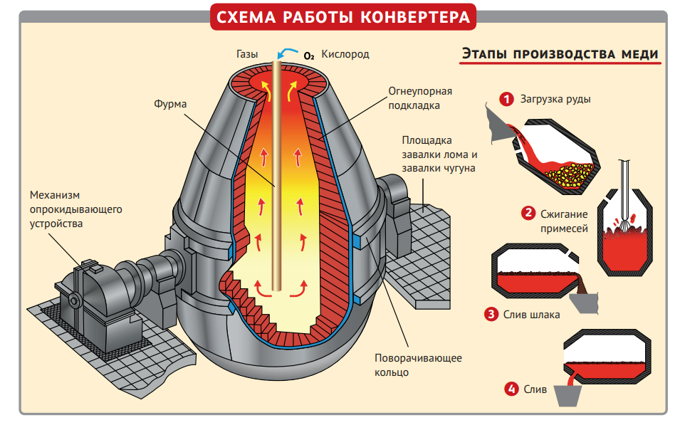 После конвертера концентрация меди в расплаве повышается почти до 99 %, но всё равно в нём остаются сторонние элементы — железо, цинк и даже небольшой процент золота и серебра. Поэтому жидкий металл выливают из конвертера и отправляют на дальнейшую переработку.