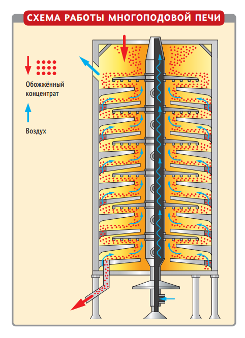 Как же работает пирометаллургия? Если кратко, металлурги пытаются сжечь лишние примеси в руде. Для этого в цехах металлургических комбинатов строят огромные печи (до десяти метров в высоту) — вертикальные стальные цилиндры, выложенные огнеупорным кирпичом. Топочное пространство печи делится по высоте на горизонтальные поды (поверхности), расположенные один под другим. Поэтому такие печати называют многоподовыми.