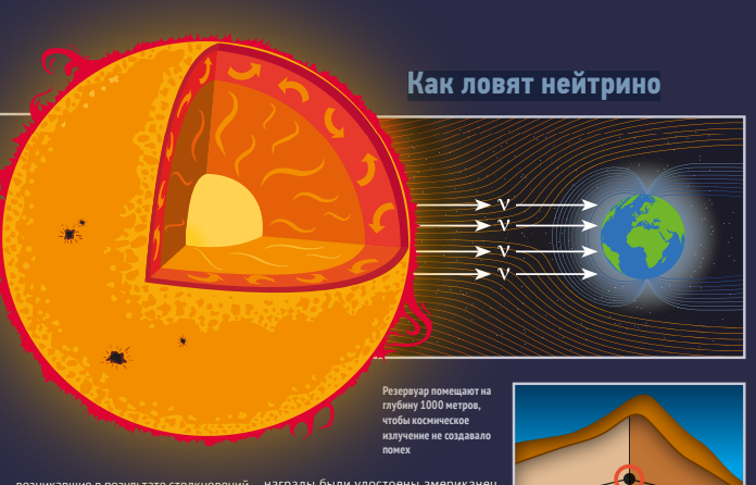 Об экспериментальном открытии третьего вида нейтрино, тау-нейтрино, было официально объявлено в июле 2000 года, но нобелевскую премию за него так и не дали. Зато в 2002 г. этой награды были удостоены американец Рэймонд Дэйвис-младший и японец Масатоси Косиба, возглавлявшие две независимые исследовательские группы, которым впервые удалось экспериментально зарегистрировать космические нейтрино. Группа Дэйвиса на протяжении почти 30 лет на специальном подземном детекторе Homestake в штате Южная Дакота кропотливо отлавливала нейтрино, образующиеся в ходе реакций ядерного синтеза на Солнце. Схожие результаты были получены японской группой Косибы на другой специальной мега-установке Kamiokande, построенной на глубине более километра под горой Камиока.