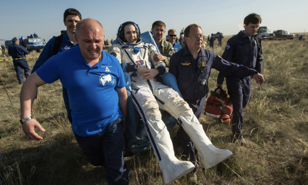 В старости из костей вымывается кальций. Кости становятся хрупкими. У космонавтов происходят похожие процессы из-за условий микрогравитации: не получая постоянной нагрузки, кости истончаются. Особенно страдают суставы, на которые в земных условиях приходится наибольшая нагрузка. Причём, восстановление костей занимает в несколько раз больше времени, чем срок, проведённый на орбите.
