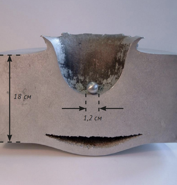 Результат удара металлической бусинки диаметром 1,2 см на скорости 6,8 км/с о металлический брус толщиной 18 см