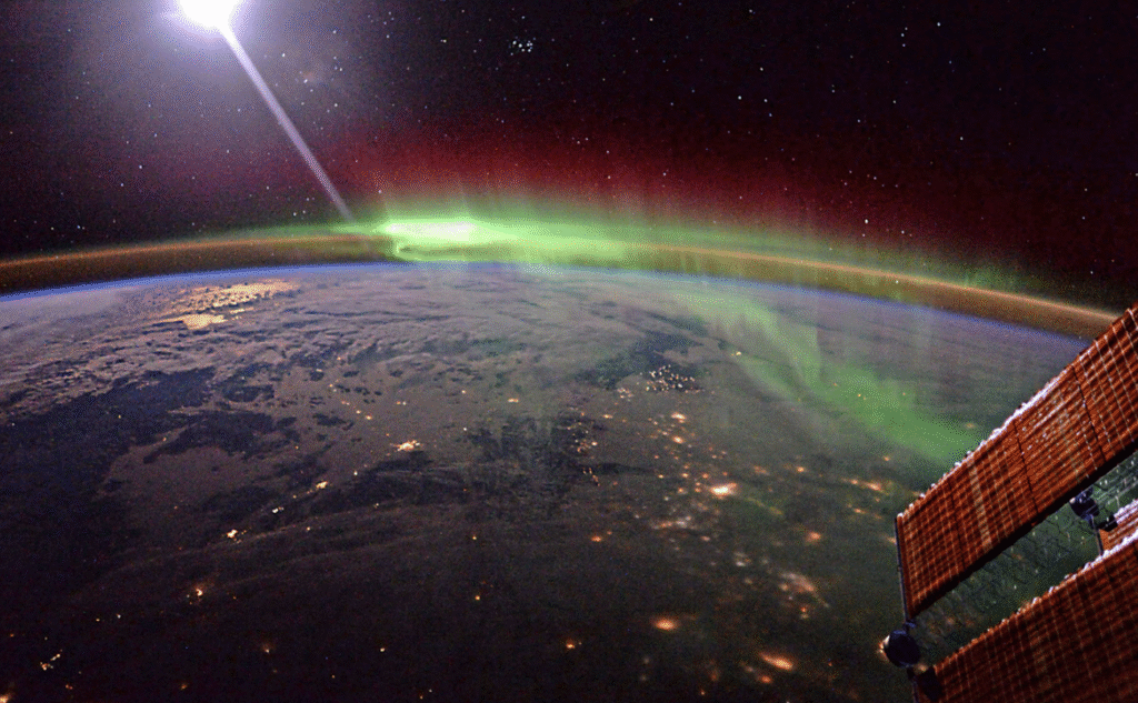 - Частицы — продукты радиоактивного распада на Солнце, долетая до верхних слоев атмосферы, они сталкиваются с молекулами кислорода и азота на высоте 40–300 км.