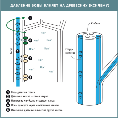 Паразиты вгрызаются во флоэму, чтобы отобрать у растения часть питательных веществ. Давление внутри при этом падает, и это воспринимают как гидравлический сигнал специальные каналы в мембранах клеток. В ксилеме давление тоже меняется: увеличивается при избытке влаги и падает при засухе. Все эти события в древесине воспринимаются с помощью клеточных каналов. Их створки открываются, когда растягивается мембрана, в которой они находятся, и схлопываются, когда натяжение падает. Сквозь открытые каналы проходят заряженные частицы — ионы. Направление движения ионов — внутрь клетки или наружу — зависит от их концентрации. Так изменяется мембранный потенциал клетки, рядом с которой прошёл гидравлический сигнал.