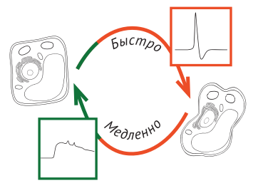 Пожалуй, самый интересный из электрических сигналов растений — это потенциал действия (ПД). Этот сигнал есть и у животных, но у растений механизм его работы несколько отличается. У растений ПД распространяется быстрее всех остальных сигналов. Эксперименты с поджиганием живых листьев сои показали, что этот электрический сигнал облетает всё растение за доли секунды, а его скорость при этом составляет 105,5 м/с. Впрочем, чаще этот показатель гораздо скромнее — до нескольких десятков сантиметров в секунду, как и у животных, — но и это значение впечатляет. ПД растений, как и наши с вами, передаются по поверхности клеточных мембран, а не в жидкости, как это происходит у системных и вариационных потенциалов. Сигналы возникают, когда в клетку входят ионы кальция Ca2+ и одновременно с этим выходят ионы хлора Cl−. У животных сигнал генерируется по-другому: ПД в нервных клетках обеспечивает вход ионов натрия Na+, однако в клетках сердечной мышцы потенциал действия зависит от кальция.