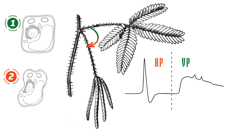 Некоторые клетки в черешках листьев мимозы стыдливой способны быстро терять воду, когда получают сигнал в виде потенциала действия. Благодаря этому объём черешков резко падает, и все листики, принадлежащие данному черешку, складываются.