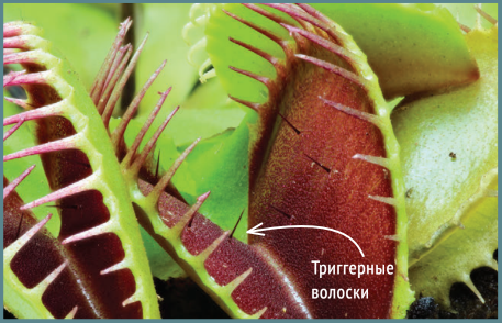 Кончики листьев венериной мухоловки (Dionaea muscipula) несут триггерные волоски. Когда что-то прикасается к ним, генерируются потенциалы действия, «приказывающие» ловчим листьям схлопнуться.