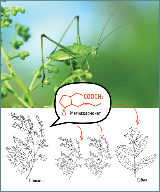 Одно из таких соединений — производное жасмоновой кислоты, метилжасмонат. Его образует полынь, когда её грызут кузнечики. Метилжасмонат сигнализирует «родному» растению и его соседям, что надо повысить в листьях и стеблях содержание неприятных на вкус дубильных веществ — фенолов. Ветки полыни с повреждениями покровной ткани провоцируют выделение фенолов не только в растениях своего вида, но и у совершенно других — например у табака.
