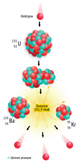 Свойства урана кардинально меняются, если воздействовать на него извне. Для начала опишем «механику» обычного полу распада: нестабильное ядро (поведение ядра зависит от соотношения протонов и нейтронов) выбрасывает из себя либо альфа-частицу (два протона и два нейтрона) и «съезжает» по таблице Менделеева на две клетки назад, либо бета-частицу — электрон, сопровождающий превращение нейтрона в протон (тут мы «продвигаемся» на клетку вперёд). Уран — не исключение, и в обычных условиях процесс идёт крайне неспешно — миллионы и миллионы лет (вспомните период полураспада!). Совсем другое дело, если в это ядро попадает лишний нейтрон. Как мы помним, уран балансирует на тонкой грани равновесия между внутренними ядерными силами и электрическим взаимодействием. И как невесомая снежинка вызывает сход лавины, так и лишний нейтрон нарушает хрупкое равновесие и вынуждает ядро развалиться на части, высвободив огромную энергию. И самое главное — при этом также освобождается от 1 до 8 свободных нейтронов, которые взаимодействуют с другими ядрами; те высвобождают энергию и новые нейтроны, и так далее. Этот процесс называют цепной ядерной реакцией. В результате выбрасывается огромное количество энергии при минимальных затратах (это очень важный пункт).
