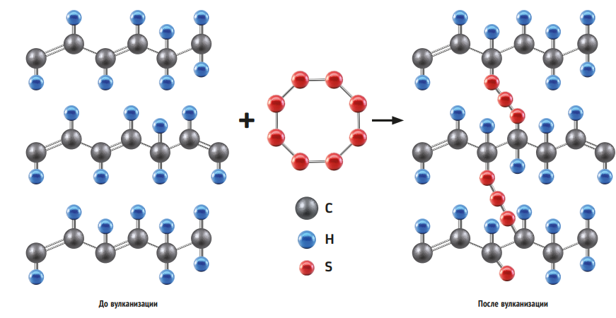 Каучук — это природный полимер, состоящий из цепочек изопреновых звеньев (органическое соединение с двумя двойными связями — 2-метил-1,3-бутадиен CH2 =C(CH3 )CH=CH2 ), которые беспорядочно перепутаны и слабо соединены между собой. При нагревании цепочки скользят, и каучук превращается в липкое и текучее вещество. Что же такого волшебного делает сера? Атомы этого элемента связывают разные полимерные цепочки прочными дисульфидными мостиками по схеме ~C-S-S-C~, образуя разветвлённую сетку сложной конфигурации. Именно она придаёт резине свойства отличные от каучука, причём достигается это при мизерной доле серы — всего 0,3%. При повышении серы до 3% дисульфидных мостиков становится больше, и такой материал уже может применяться, к примеру, в уплотнителях и поливочных шлангах.