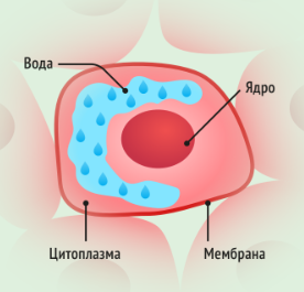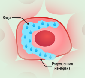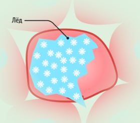 При охлаждении ниже 4°С молекулы воды перестраиваются, образуя кристаллическую решётку. Расстояние между молекулами в ней больше, чем в жидкости, поэтому объём воды увеличивается. Острые кристаллы льда необратимо разрушают мембрану клетки.