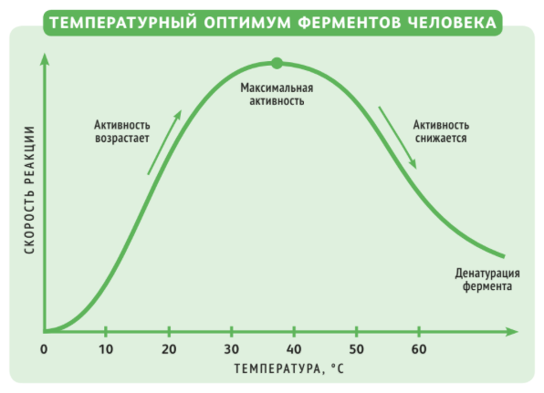 Не исключение и реакции, которые проходят в живых организмах. У них отношения с температурой особенно трепетные: почти для каждого биохимического превращения (а их тысячи) нужен свой фермент — крупная сложносоставная молекула. Слишком жарко — ферменты теряют рабочую форму или вовсе денатурируют (распадаются). Если холодно, не хватает энергии, чтобы запустить движение молекул — участниц реакции. Поэтому жизнь возможна в очень узком диапазоне температур.