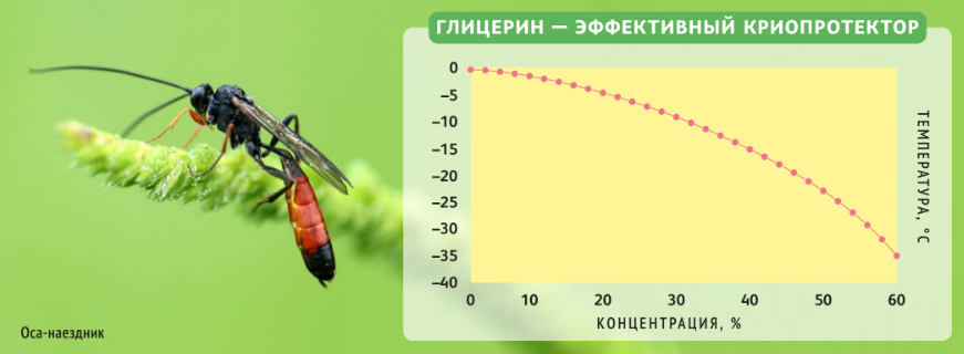 У насекомых в роли антифриза часто выступает глицерин — органическое вещество, содержащееся в гемолимфе, аналоге крови. Ближе к зиме массовая доля глицерина в гемолимфе осы-паразита Bracon cephi достигает 30%, и гемолимфа остаётся жидкой до –17,5 °C. На самом деле даже обычная поваренная соль позволяет воде дольше не замерзать, но глицерин эффективнее. Тем не менее есть животные, которые нормально переносят оледенение.