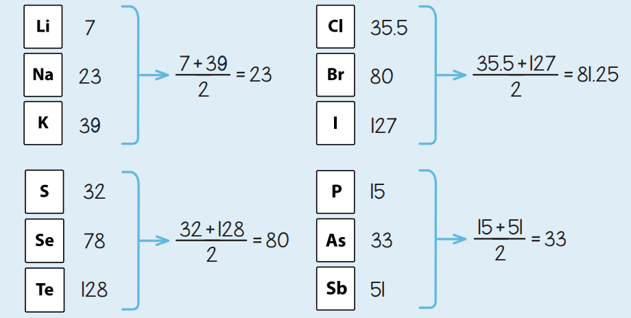 Отличительной характеристикой триад Дёберейнера был Ÿлемент в середине каждой триады, чья атомная масса является средним арифметическим двух крайних элементов