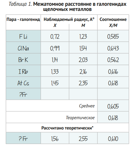 Аналогичной линией для химических элементов является расстояние между ядрами атомов в соединениях. Пусть короткий отрезок линии а — это ковалентный радиус атома галогена Х, а длинный отрезок b — это соответствующий радиус щелочного металла М. Тогда Х/М для пяти элементов первой группы (литий Li, натрий Na, калий K, рубидий Rb и цезий Cs) составляет 0,605 ± 0,043 с экспериментальной погрешностью 7% (см. таблицу 1). Причём с увеличением межъядерного расстояния отношение стремится к Фибоначчиевому золотому сечению 0,618.