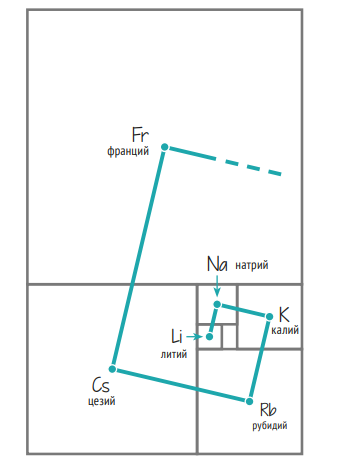 А что же с положением этих элементов в периодической таблице? Для определения их позиции в Фибоначчиевой системе, мы используем длину связи фторида лития (приведена в таблице Li F). Нарисуем прямоугольник со сторонами a + b и b (где a и b — радиусы атомов лития и фтора), а затем пририсуем к нему квадрат b × b, получим большой прямоугольник со сторонами a+b и b для пары натрий — хлор. Продолжаем рисовать к ним квадраты, увеличивая стороны a+b и b. Если нарисовать в центре каждого квадрата щелочной металл в порядке увеличения атомного номера, получим рисунок 1. Таким образом становится очевидным расположение элементов согласно схеме Фибоначчи. Если нарисовать вместо прямых линий более плавные кривые, можно получить логарифмическую спираль Фибоначчи.